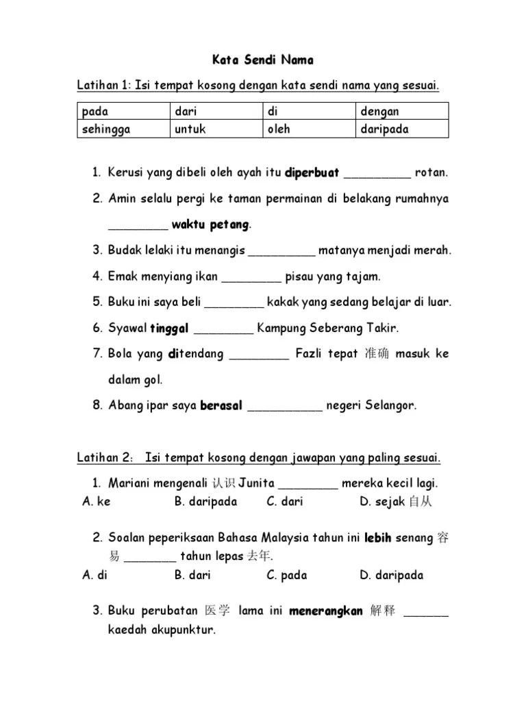 Latihan Bahasa Melayu Tahun 2 Kata Sendi Nama / Kata Sendi Nama Tahun 1 Pdf